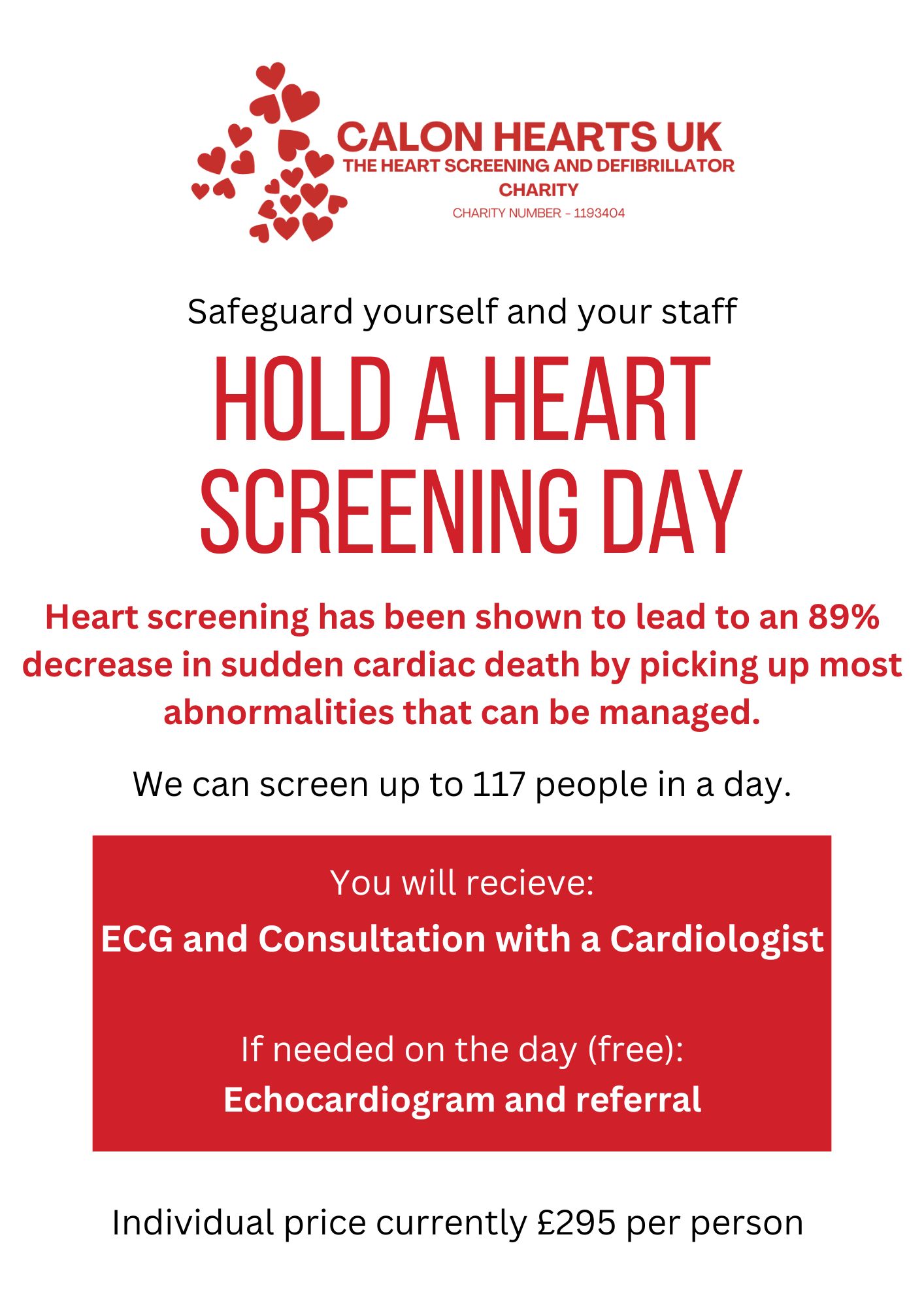 Calon Heart Screening can offer heart screening sessions for businesses, organisations and sports clubs across the country to safeguard their staff and members.